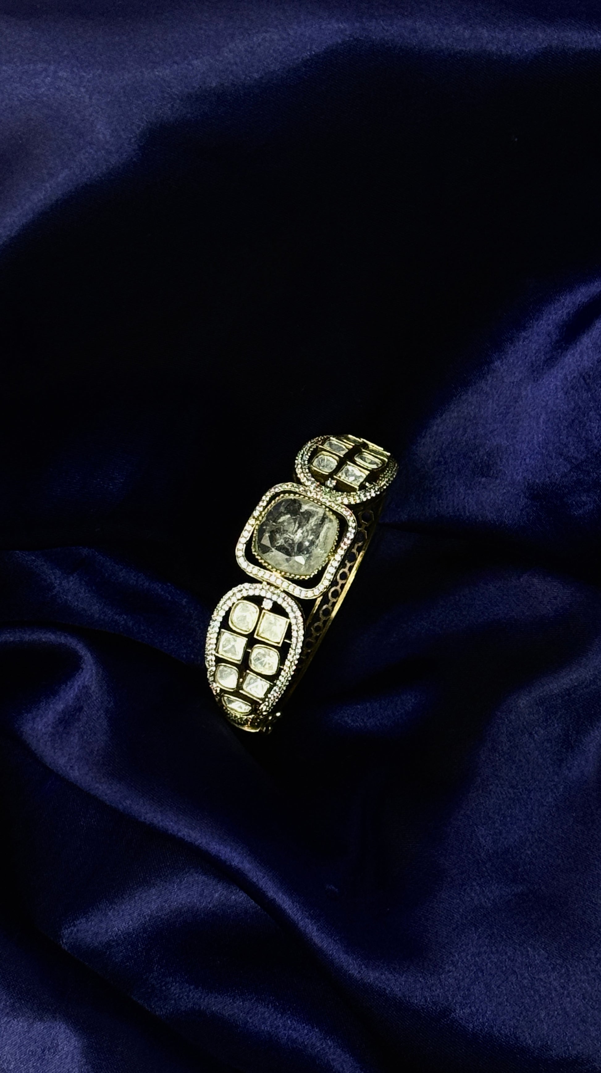 This luxurious gold-toned bangle is a stunning blend of contemporary sparkle and traditional design, featuring three distinct panels set with large, central uncut/polki-style diamond simulants (flat, organic shapes) surrounded by delicate halos of brilliant American Diamonds.